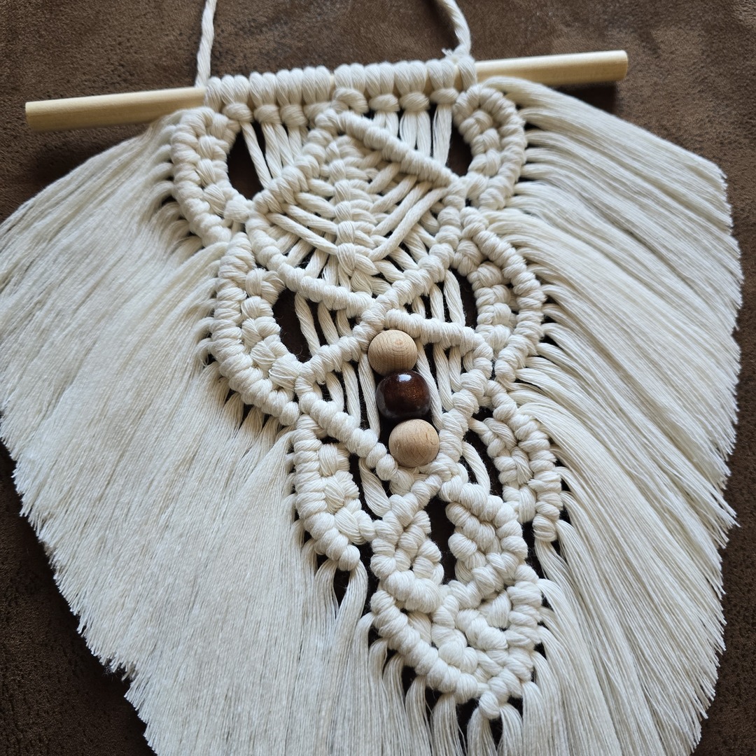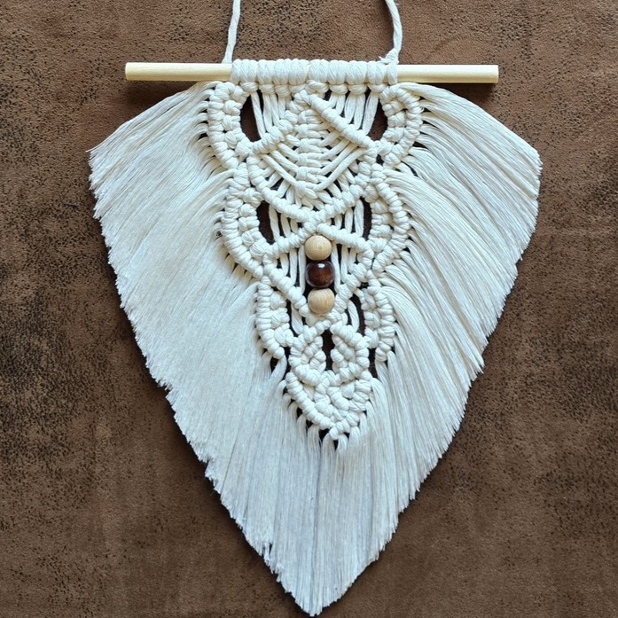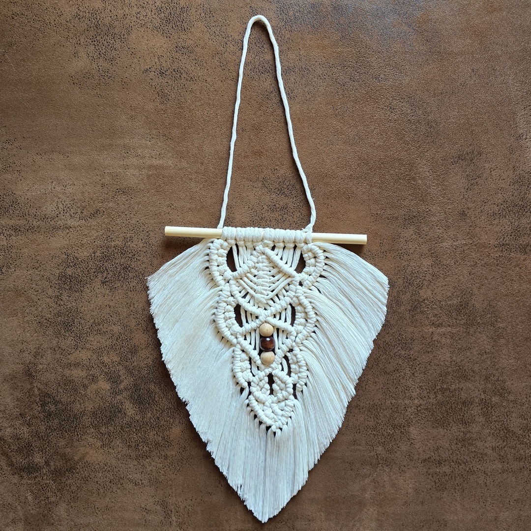 Kształt liścia symbolizuje harmonię, wzrost i bliskość z naturą🍃Całość została starannie wypleciona ręcznie, z dbałością o każdy detal, dlatego każda makrama jest wyjątkowa – tak jak rzeczy tworzone z pasją 🤍
