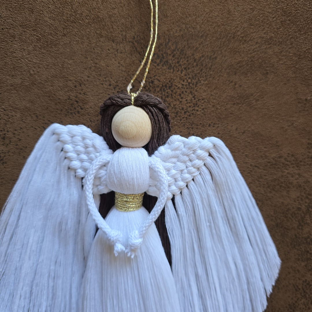 Anioł został starannie wypleciony z miękkiego, bawełnianego sznurka w kolorze czystej bieli🤍 Jego delikatną talię zdobi subtelny pasek ze złotej nitki, który dodaje całości elegancji i lekko połyskuje w świetle. Całość dopełniają włosy w głębokim, ciemnym brązie🤎które pięknie kontrastują z jasnymi skrzydłami.