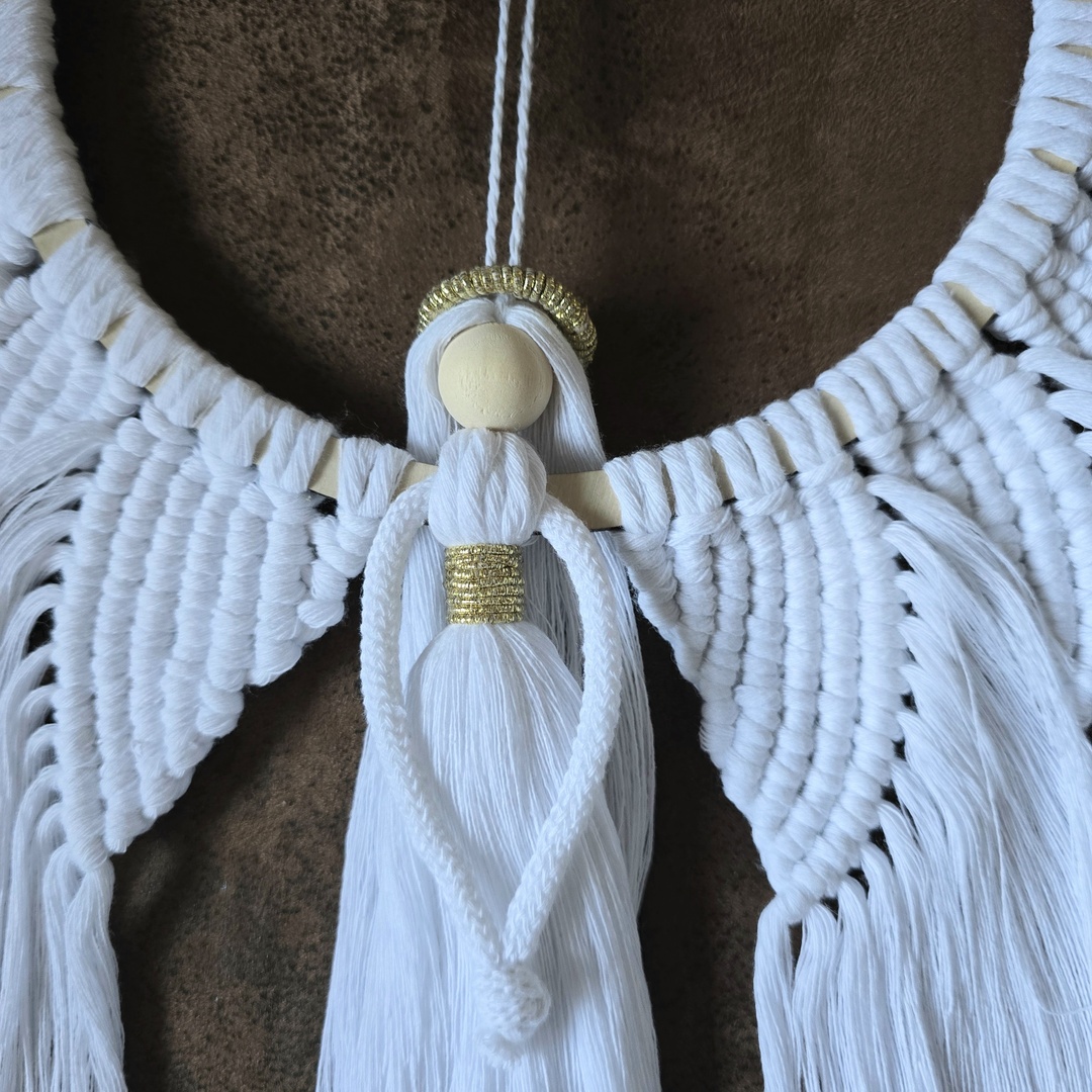 Ręcznie wykonana makrama anioła na drewnianej obręczy to wyjątkowa dekoracja, która wnosi do wnętrza ciepło i harmonię🕊️