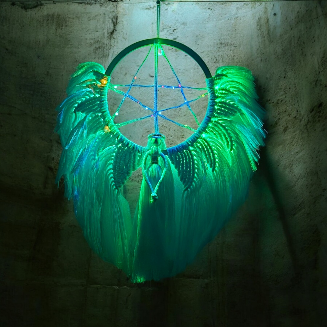 Dodatkowo możesz wybrać opcję ze światełkami💡 które delikatnie otulą anioła ciepłym blaskiem. Podświetlona makrama tworzy nastrojową atmosferę — idealną do sypialni, salonu czy pokoju dziecka. Wieczorem staje się subtelną lampką dekoracyjną, a w ciągu dnia elegancką ozdobą ściany🌟